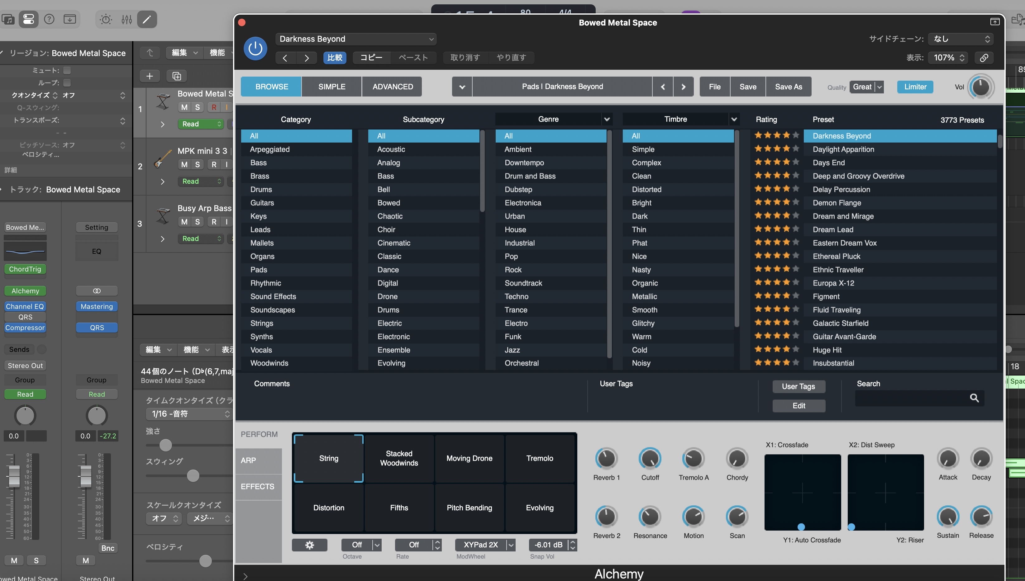 Alchemy というソフト、、シンセ、、サイザー??のいろんなところを押すと、よくわかりませんが、かっこいい音がたくさん出ます。トラックを一つにしておけばとりあえず不協和音が鳴ることはないでしょう。(鳴ります)