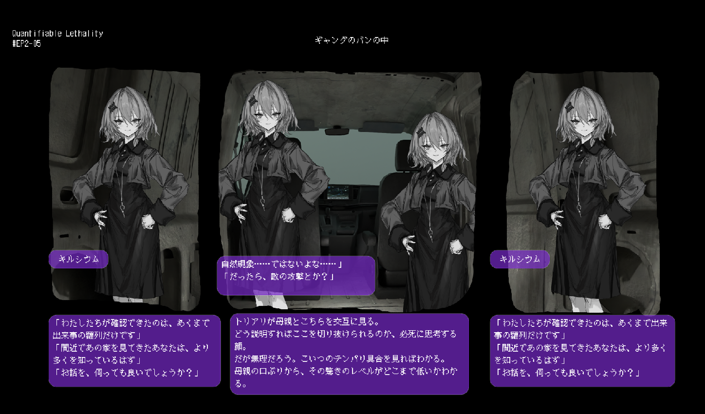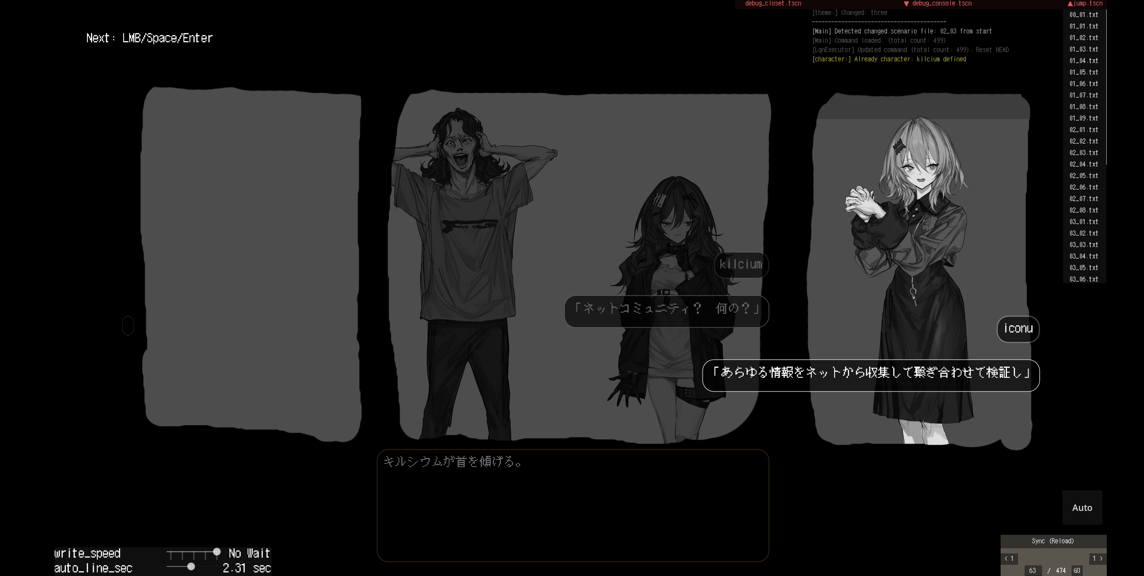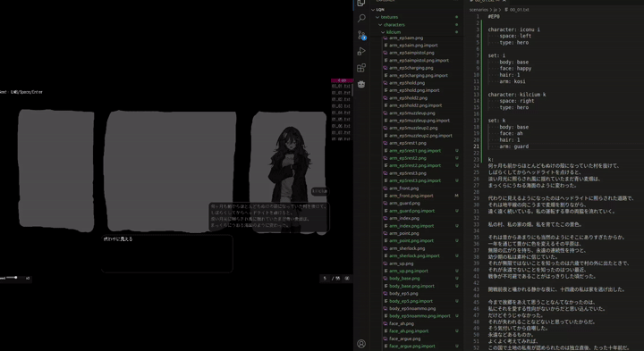 キャラクターのエイリアス機能なども実装したのですが結局あまり使われていなかったり, 振り返ると色々改善点はあるのですが, 汎用性を排除した専用スクリプトとしたことでシンプルな文法に着地できたように思えます.