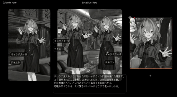 色調がグレイスケールなのもあり, シーンごとにもう少し動きが出るとうれしそう という発想から, 漫画のコマ割りのような画面のレイアウトを定義できる “テーマ” という概念が実装されました
